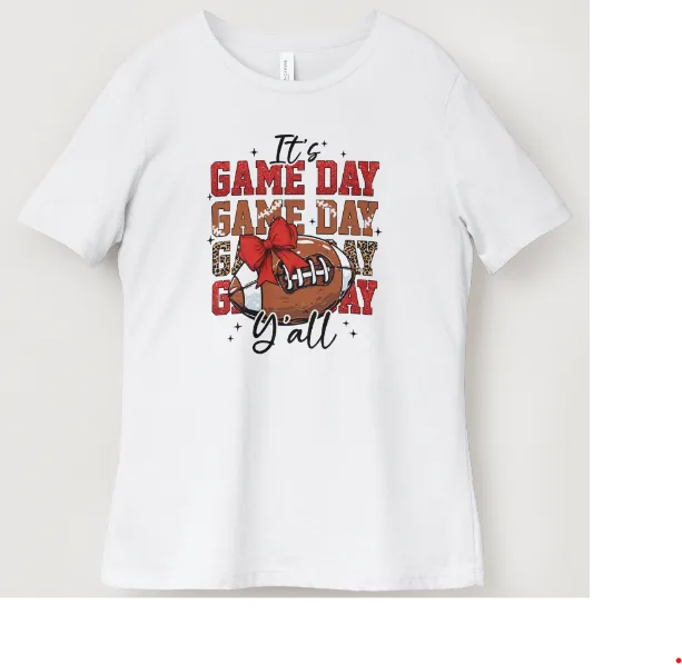 The 'It's Game Day Y'all' Cotton Football Tee offers a comfortable and stylish option for football enthusiasts. Crafted from soft, breathable cotton, this tee is designed for all-day wear, whether you're cheering in the stands or hosting a watch party at home. Its bold lettering and sporty design make it a great way to showcase your team spirit during football season. Perfect as part of your game day essentials, this versatile shirt pairs well with jeans, shorts, or casual accessories. Available in a range of sizes to ensure the perfect fit for every fan.