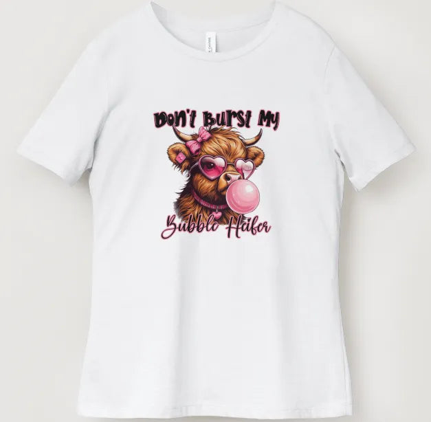 Embrace a fun and playful vibe with the "Don't burst my bubble heifer" tee, featuring a charming Highland cow happily blowing a bubble. This quirky design brings a smile and adds a lighthearted touch to your everyday look. Perfect for those who love expressing their joyful spirit with a twist of cow-inspired whimsy.