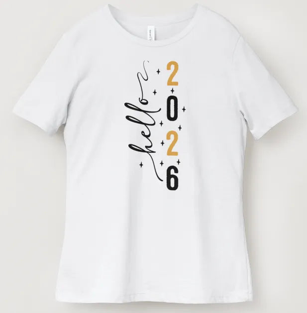 Ring in the new year with style in this Hello 2026 T-Shirt. Perfect for New Year's celebrations, parties, and fresh starts, this tee captures the excitement of a brand new year with a playful vibe. Comfortable, casual, and ready to make a statement as you welcome 2026—whether you're counting down at midnight or celebrating all season long. Grab yours and start the year looking great.