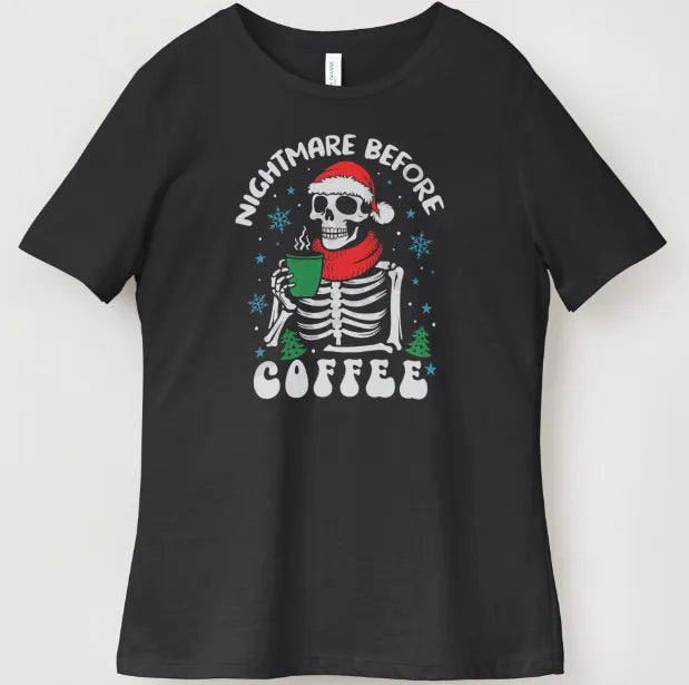 Start your mornings with a blend of spooky style and caffeine love with the "Nightmare Before Coffee" tee. Featuring a playful skeleton design holding a coffee cup, this shirt is perfect for coffee lovers who embrace their dark humor. Comfortable and eye-catching, it makes every coffee break a little more fun and boosts your daily ritual with a touch of character.
